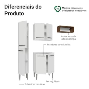 A linha Emilly possui acabamento de alta resistência e puxadores em alumínio. Possui corrediças e dobradiças metálicas, garantindo durabilidade no dia a dia. Os pés reguláveis em PVC proporcionam estabilidade e facilitam a limpeza do ambiente.