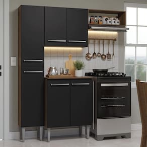 A composição conta com um paneleiro de duas portas, um balcão com duas portas e tampo, um aéreo de com duas portas e um nicho aberto. A combinação do acabamento em tom amadeirado Rustic com Preto traz um estilo contemporâneo e cheio de personalidade para a sua cozinha.