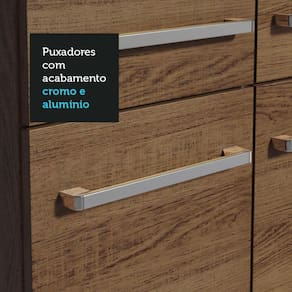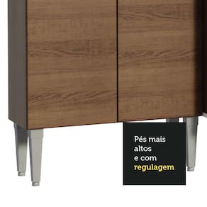 Possui dobradiças e corrediças metálicas, puxadores com alumínio e pés em PVC com regulagem de altura, que permitem que você ajuste o móvel a pequenos desníveis no piso, garantindo estabilidade e segurança.