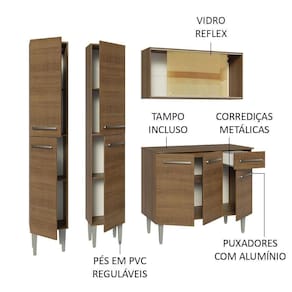 Com excelente custo-benefício , esta cozinha é fabricada com materiais duráveis , garantindo maior vida útil. Possui corrediças e dobradiças metálicas, puxadores com alumínio e pés ajustáveis em PVC.