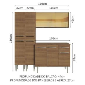 - 44 cm de profundidade no balcão e 27 cm de profundidade nos aéreos e nos paneleiros