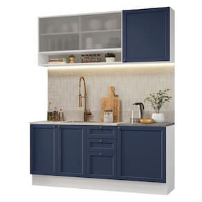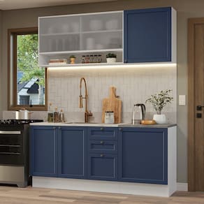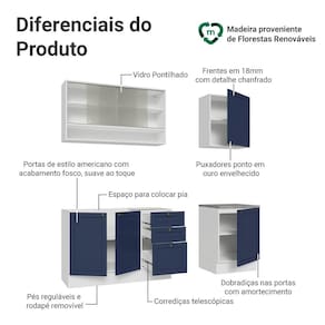 O acabamento de alta resistência da estrutura é em Branco, das frentes em Azul e possui uma textura suave ao toque. O destaque fica por conta dos puxadores ponto em ouro envelhecido, feitos com metal resistente, trazem personalidade e um charme único. Outro diferencial está no detalhe chanfrado das frentes, que forma molduras elegantes e dá profundidade ao design.