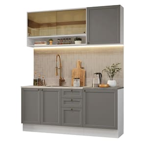 O acabamento de alta resistência da estrutura é em Branco, das frentes em Cinza e possui uma textura suave ao toque. O destaque fica por conta dos puxadores ponto em ouro envelhecido, feitos com metal resistente, trazem personalidade e um charme único. Outro diferencial está no detalhe chanfrado das frentes, que forma molduras elegantes e dá profundidade ao design.