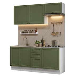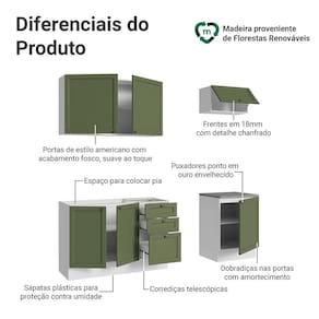 Além disso, a linha Vik é funcional em cada detalhe. As portas possuem dobradiças com amortecimento, garantindo um fechamento suave e silencioso, enquanto as gavetas com corrediças telescópicas permitem abertura total, para você organizar tudo que precisa com muito mais facilidade. O acabamento de alta resistência da estrutura é branco e das frentes em verde, possui uma textura suave ao toque. O destaque fica por conta dos puxadores ponto em ouro envelhecido, feitos com metal resistente, trazem personalidade e um charme único.