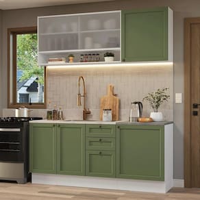 Cor: Verde | Garantia: 3 meses contra defeitos de fabricação | Dimensões - Altura: 225 cm | Dimensões - Largura: 180 cm | Dimensões - Profundidade: 52 cm | Produto: Cozinha Compacta | Marca: Madesa | Peso aproximado: 99 kg | Material: MDP | Estado de Origem: RS | Conteúdo da embalagem: Uma Cozinha Compacta | Material para Filtro: MDP | Instruções/Cuidados: Utilize um pano limpo, levemente umedecido e seque em seguida a superfície. Não usar produtos químicos ou abrasivos para a limpeza. Recomendamos polir seu móvel com lustra-móveis duas a três vezes por ano. | Produto precisa de Montagem?: Sim | Inclui tampo: Não | Peso Produto Com Embalagem (Kg): 99,31 | Altura do Produto com Embalagem (cm): 66,1 | Largura Produto Com Embalagem (cm): 60,5 | Comprimento Produto Com Embalagem (cm): 125,6 | Descrição do Tamanho: 225 cm x 180 cm x 52cm | Nome do Simples no Fornecedor: Armário de Cozinha Compacta 180 cm Branco/Verde Vik Madesa 03 | Fabricante: Madesa | RBN: Casa/Móveis/Móveis para Escritório em Casa | Quantidade de Gavetas: 3 | Quantidade de portas: 6 | Tipo de móveis de cozinha: Cozinha Completa | Materiais do corpo: MDP | Quantidade de caixas de embalagem: 10 | Bullet Point 0: Dimensões: 225 cm altura x 180 cm largura x 52 cm profundidade | Bullet Point 1: A combinação perfeita entre design clássico e elementos modernos | Bullet Point 2: Inspiração no estilo americano, frentes com acabamento chanfrado e textura fosca suave ao toque | Bullet Point 3: Puxadores ponto em ouro envelhecido e portas com fechamento suave | É Frágil: Não | Quantidade de Itens: 1 | Certificação de teste externa: Sim | Modelo: GRVK180003L9 | Componentes incluídos: Portas | Precisa de baterias ou pilhas: Não | Número da peça: GRVK180003L9 | Preço sugerido sem impostos: 2399.9899999999998 | Peso do item (item_weight): value=99.31;unit=kilograms | Dimensões do item P x L x A (item_depth_width_height): depth#value=52;depth#unit=centimeters;height#value=225;height#unit=centimeters;width#value=180;width#unit=centimeters | Requer montagem (REQUIRES_ASSEMBLY): Sim | Inclui manual de montagem (INCLUDES_ASSEMBLY_MANUAL): Sim Cor: Branco/Verde