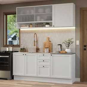 A cozinha compacta Vik da Madesa oferece organização inteligente e um design que une o charme do estilo americano com toques modernos e elegantes.