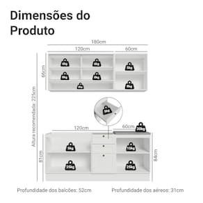 - 52 cm de profundidade nos balcões e 31cm nos aéreos