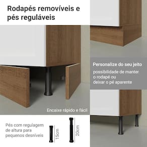 O acabamento de alta resistência da estrutura é em tom amadeirado Rustic, das frentes em Branco e possui uma textura suave ao toque. O destaque fica por conta dos puxadores ponto em ouro envelhecido, feitos com metal resistente, trazem personalidade e um charme único. Outro diferencial está no detalhe chanfrado das frentes, que forma molduras elegantes e dá profundidade ao design.