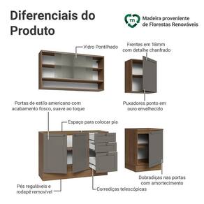 O acabamento de alta resistência da estrutura é em tom amadeirado Rustic, das frentes em Cinza e possui uma textura suave ao toque. O destaque fica por conta dos puxadores ponto em ouro envelhecido, feitos com metal resistente, trazem personalidade e um charme único. Outro diferencial está no detalhe chanfrado das frentes, que forma molduras elegantes e dá profundidade ao design.