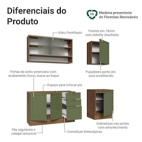 O acabamento de alta resistência da estrutura é em tom amadeirado Rustic, das frentes em Verde e possui uma textura suave ao toque. O destaque fica por conta dos puxadores ponto em ouro envelhecido, feitos com metal resistente, trazem personalidade e um charme único. Outro diferencial está no detalhe chanfrado das frentes, que forma molduras elegantes e dá profundidade ao design.