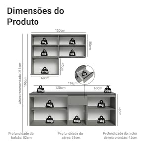 - 52 cm de profundidade nos balcões, 31 cm no aéreo e 45 cm no nicho de micro-ondas