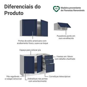 Além disso, a linha Vik é funcional em cada detalhe. As portas possuem dobradiças com amortecimento, garantindo um fechamento suave e silencioso, enquanto as gavetas permitem abertura total, garantindo muito mais facilidade. O acabamento de alta resistência da estrutura é na cor Branca e das frentes em Azul, possui uma textura suave ao toque. O destaque fica por conta dos puxadores ponto em ouro envelhecido, feitos com metal resistente, trazem personalidade e um charme único.