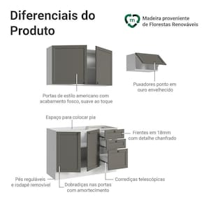 Os armários e balcões foram cuidadosamente projetados para aproveitar ao máximo o espaço, o balcão de pia, permite a instalação de pia de inox ou pedra. Além disso, o aéreo com porta basculante possui um sistema de pistão a gás que mantém a porta suspensa quando aberta, proporcionando mais praticidade e no uso diário.