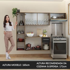 Um grande diferencial é que esta cozinha é suspensa, detalhe que deixa o ambiente mais clean e facilita a limpeza. Além disso, o espaço disponível é ótimo, ideal para armazenar utensílios, panelas, eletroportáteis e muito mais.