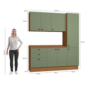 Já as frentes, na cor verde frevo, contam com acabamento fosco em BP, proporcionando maior durablidade contra riscos, arranhões e gotas d'água. Uma combinação aconchegante e moderna, remetendo aos tons da natureza e deixando seu ambiente lindo, incluindo facilidade durante a limpeza. Compacto e funcional, são 2,20m de altura, 1,90m de largura e 52cm de profundidade, o combo é perfeito para aproveitar espaço na vertical, o combo une balcões, aéreos e o paneleiro, uma composição versátil e indispensável para todos os espaços.
