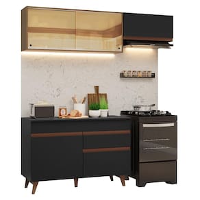 Formada por três módulos avulsos, possui materiais de alta qualidade, como corrediças e dobradiças metálicas, puxadores embutidos de alumínio e pés de madeira maciça. O vidro reflex no aéreo deixa a cozinha ainda mais sofisticada.