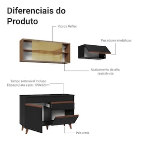 O espaço é amplo, ideal para louças, panelas e utensílios. O balcão acompanha tampo em MDP e pode ser removido para instalação de pia com espaço de 120 x 52 cm.