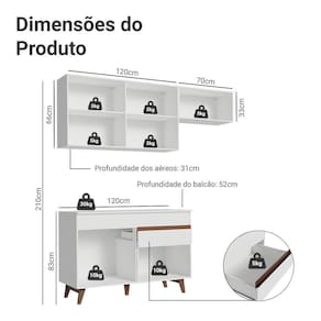- 52 cm de profundidade no balcão e e 31 cm nos aéreos