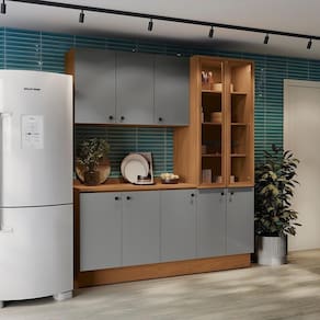 Já as frentes, na cor cinza sagrado, contam com acabamento fosco em BP, proporcionando maior durablidade contra riscos, arranhões e gotas d'água. Uma combinação elegante e moderna, que dará ainda mais destaque ao seu espaço, deixando sua cozinha perfeita. Compacto e muito moderno, unindo balcões, aéreos e cristaleira, são 2,20m de altura e 1,90m de largura, com 52cm de profundidade, para o melhor aproveitamento de espaço na vertical. Acompanhado dos tampos, os balcões também podem ser montados com pedra, oferecendo amplo espaço para organizar louças e mantimentos.
