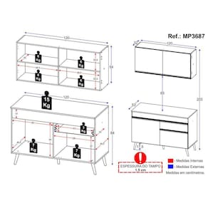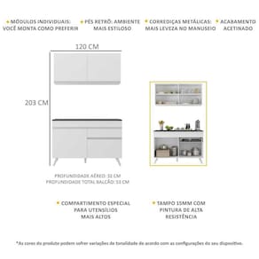 Altura: 203cm | Largura: 120cm | Profundidade: 32cm (aéreos) - 53cm (balcão com tampo)