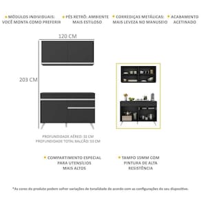 Dimensões do produto montado: Altura: 203cm | Largura: 120cm | Profundidade: 32cm (aéreos) - 53cm (balcão com tampo) *Você pode consultar as medidas internas na imagem técnica do produto.