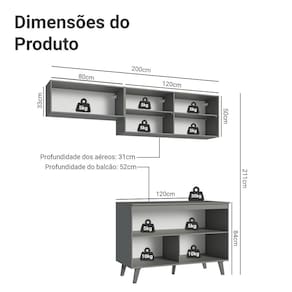 - 52 cm de profundidade no balcão e 31 cm nos aéreos