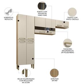 O Paneleiro conta com quatro portas e duas prateleiras internas, oferecendo ampla capacidade de armazenar mantimentos e utensílios de maneira eficiente. O Armário Aéreo possui duas portas com um detalhe em vidro na parte central, que traz leveza ao móvel. Ele ainda dispõe de uma prateleira interna, excelente para organizar louças, copos e porcelanas, mantendo tudo ao alcance das mãos. O Armário de Geladeira, com duas portas, complementa perfeitamente o conjunto.