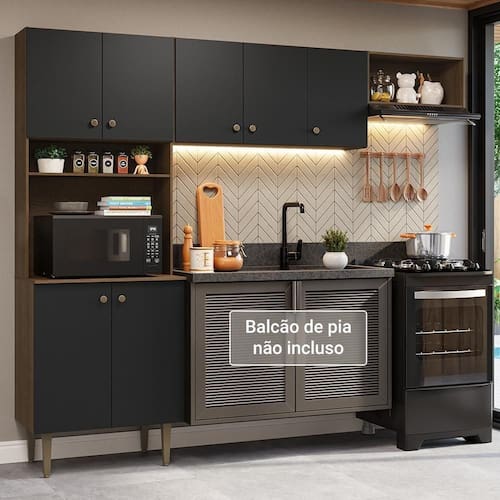 Com amplo espaço interno, este armário é perfeito para organizar utensílios de cozinha, louças e eletros. Além disso, oferece um compartimento ideal para forno ou micro-ondas.