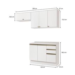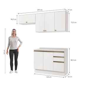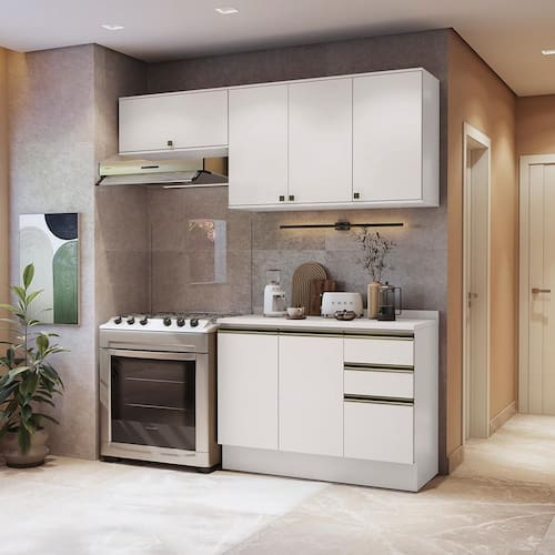 Compacto e funcional, perfeito para espaços menores, o combo une balcão e aéreo de pia, acompanhado ainda do aéreo basculante de 80cm, uma composição versátil e indispensável para quem procura por funcionalidade. Acompanhado do tampo, o balcão ainda pode ser montado com cuba ou pedra, e com três gavetas e muitas prateleiras, ele conta com amplo espaço para organizar louças e mantimentos.