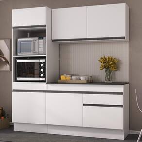 O Armário de Cozinha Compacta 3 peças com Rodapé MP2177 Made Multimóveis é produzido em MDP 12/15mm com acabamento acetinado (cerca de 20% de brilho), garantindo maior durabilidade e resistência. Com amplo espaço interno, possui 6 portas (sendo 2 basculantes), prateleiras, 1 gaveta com corrediças metálicas (mais leveza no manuseio), puxadores em ABS e rodapés que deixam o ambiente mais estiloso. Os módulos são individuais, podendo ser montados da maneira que se adaptarem melhor ao seu ambiente. Para deixar sua cozinha mais funcional e organizada, este conjunto acompanha balcão com tampo removível (compatível com pia de 120cm), módulo para forno e micro-ondas, além de compartimento especial para utensílios mais altos. Esta é uma excelente opção para tornar sua cozinha elegante e prática!