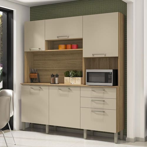Contém também espaço para forno ou micro, trazendo a praticidade de ter tudo em um só produto.