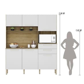 Conta com nicho para pequenos objetos, além disso, tem nicho para micro-ondas e passa-fio no traseiro facilitando o acesso à tomada na parede. O espaço interno é bem dividido com a utilização de prateleiras, para melhor organizar os utensílios da cozinha.