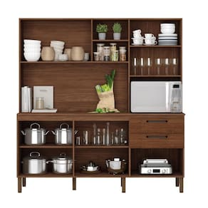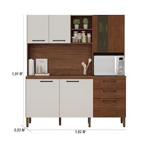 Conta com nicho para pequenos objetos, além de nicho para microondas. O espaço interno é bem dividido com a utilização de prateleiras para melhor organizar os utensílios da cozinha.