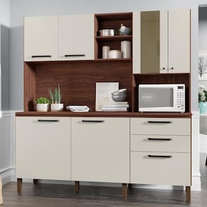 Conta com nicho para pequenos objetos, além de nicho para microondas. O espaço interno é bem dividido com a utilização de prateleiras para melhor organizar os utensílios da cozinha.