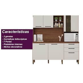A Cozinha possui sete portas sendo uma com vidro reflecta que destaca a peça em seu ambiente, duas amplas gavetas com corrediças telescópicas 100% metálicas que possibilitam a abertura total da gaveta.