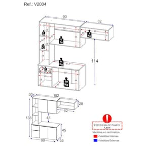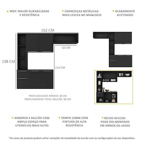 Altura: 138cm | Largura: 152cm | Profundidade: 30cm (aéreos) - 38cm (balcão com tampo)