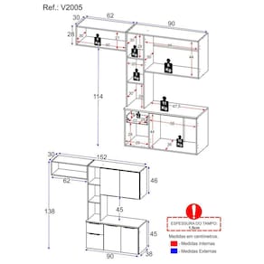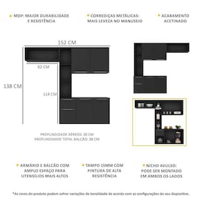 Altura: 138cm | Largura: 152cm | Profundidade: 30cm (aéreos) - 38cm (balcão com tampo)
