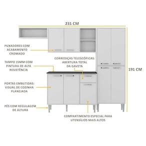 Altura: 191 cm / Largura: 231 cm / Profundidade: 27,5 cm (aéreos e paneleiro) - 45 cm (balcão com tampo) / Espaço do nicho para fogão/geladeira: Altura: 168 cm - Largura: 63 cm