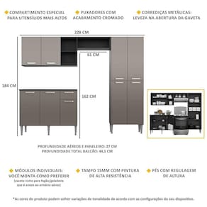 Cozinha: Altura: 184cm | Largura: 228cm | Profundidade: 27cm (aéreos e paneleiro) - 44,5cm (balcão com tampo)