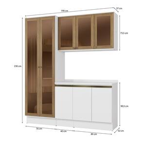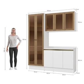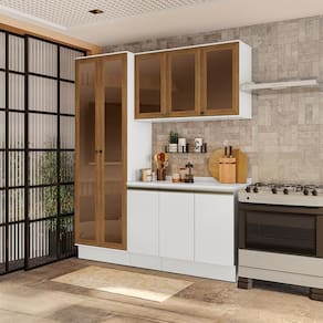 E para ainda mais destaque e beleza, a moldura nas portas da cristaleira são na cor nogueira, garantindo destaque na medida certa. Compacto e muito moderno, o combo permite aproveitar espaço na vertical, unindo balcões, aéreos e cristaleira, uma composição versátil e indispensável para todos os espaços. Acompanhado dos tampos, os balcões também podem ser montados com pedra, oferecendo amplo espaço para organizar louças e mantimentos.