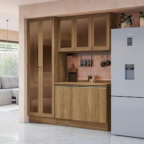 Remetendo aos tons da natureza, você terá o espaço ideal para armazenar seus itens e preparar suas receitas com praticidade. Compacto e muito moderno, o combo permite aproveitar espaço na vertical, unindo balcões, aéreos e cristaleira, uma composição versátil e indispensável para todos os espaços. Acompanhado dos tampos, os balcões também podem ser montados com pedra, oferecendo amplo espaço para organizar louças e mantimentos.