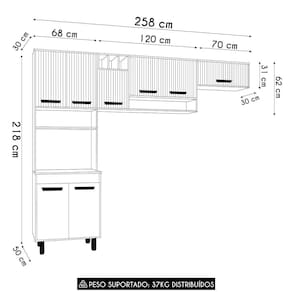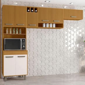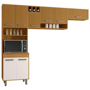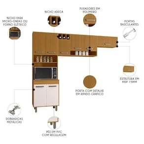 O Paneleiro foi pensado para otimizar o espaço, contando com quatro portas para muito mais organização no dia a dia. Inclui um nicho para micro-ondas ou forno elétrico e um nicho decorativo perfeito para expor seus itens favoritos. O Armário Aéreo traz ainda mais funcionalidade, com três portas, um nicho para temperos e um nicho adega com três compartimentos. Já o Armário de Geladeira completa a composição com uma porta basculante com pistão a gás, proporcionando um movimento suave e .
