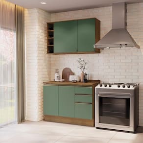 Acabamento: Pintura Fosco / Pintura Touch | Cor: Nogueira/Verde Oliva | Corrediças: Telescópicas | Dobradiça: Com Amortecimento | Garantia: 3 meses para defeito de fabricação | Matéria-prima: MDF / MDP | Peso suportado por cada gaveta: 6 Kg | Peso suportado por cada prateleira: 7 kg | Puxadores: Metálicos / Puxadores de Metal e de Alumínio | Quantidade de gavetas: 3 | Quantidade de portas: 1 | Quantidade de prateleiras: 1 / 5 | Sistema de montagem: Parafuso Philips | Tipo de porta: Bater | Duração da garantia: 3 meses | Tipo de garantia: Garantia do fabricante | Tipo de móveis de cozinha: Combo de móveis de cozinha | Requer montagem: Sim