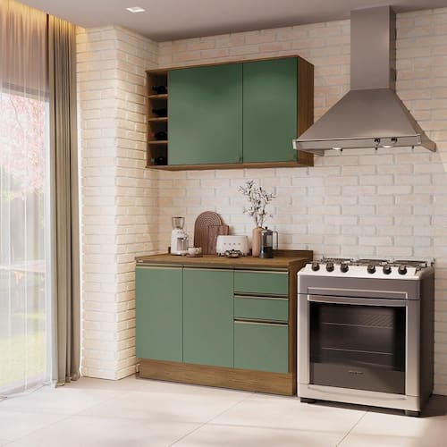 Transforme sua cozinha com toda a beleza e praticidade do Conjunto CB1387 da Cozinha Celeste Kappesberg. Produzido 100% em MDF de 15mm, o que garante mais robustez, firmeza e qualidade, além de um acabamento perfeito. São 230cm de altura, 120cm de largura e 52cm de profundidade no balcão e 37cm nos aéreos. A caixaria, em pintura touch na cor nogueira, conta com a textura dos veios da madeira, enquanto as frentes são na cor verde oliva, com acabamento fosco.