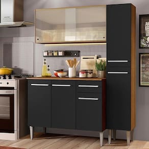 A Cozinha Emilly Force é fabricada com materiais de qualidade, como puxadores com detalhe em alumínio e corrediças e dobradiças metálicas. Os pés são em PVC, para facilitar a limpeza e reguláveis para nivelar pequenas imperfeições no piso.