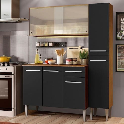 O armário aéreo possui duas portas de correr de vidro, um detalhe que traz mais sofisticação e elegância à sua cozinha.