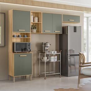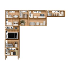 Modelo: Cozinha Maria Flor; Material da estrutura: MDP em 12 mm e 15 mm; Dimensões: 260 cm(L) x 212 cm(A) x 43 cm(P) Profundidade inferior: 43 cm; Profundidade superior: 29,9 cm; Quantidade de portas: 05 (dobradiças metálicas); Com puxador: sim, em MDF; Quantidade prateleiras: 5; Pés com regulagem: Sim, em plástico; Peso suportado: até 55 kg distribuídos; Requer montagem: Sim (kit montagem incluso).