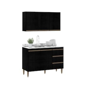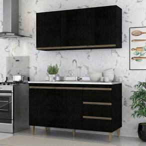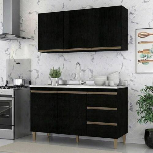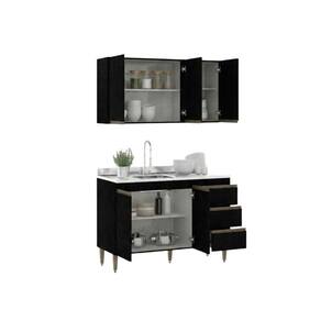 O kit é composto por um armário aéreo de três portas e um balcão amplo, ideal para quem busca uma solução completa de organização para cozinhas compactas ou áreas de lazer Design moderno na cor preta com puxadores em bronze agrega um toque de luxo à decoração Divisórias inteligentes permitem acomodar desde mantimentos e louças até utensílios pesados, garantindo que tudo esteja sempre ao alcance das mãos. O melhor em móveis no design atual aliando conforto, qualidade e ótimos preços, só na Menu Móveis!