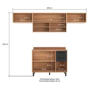 Altura: 220cm | Largura: 260cm | Profundidade: 50cm (balcões) - 30cm (armários aéreos)