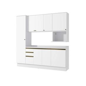 Completo e muito funcional, perfeito para todos os espaços, o combo une dois balcões, um de 60cm e o balcão de pia, além dos aéreos nas mesmas medidas, incluindo ainda o nicho para microondas e o paneleiro, uma composição completa e muito versátil, indispensável para quem procura por funcionalidade. Acompanhados dos tampos, os balcões permitem ser montados com cuba ou pedra, oferecendo amplo espaço para organizar louças e mantimentos.